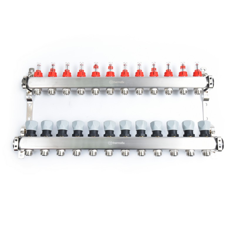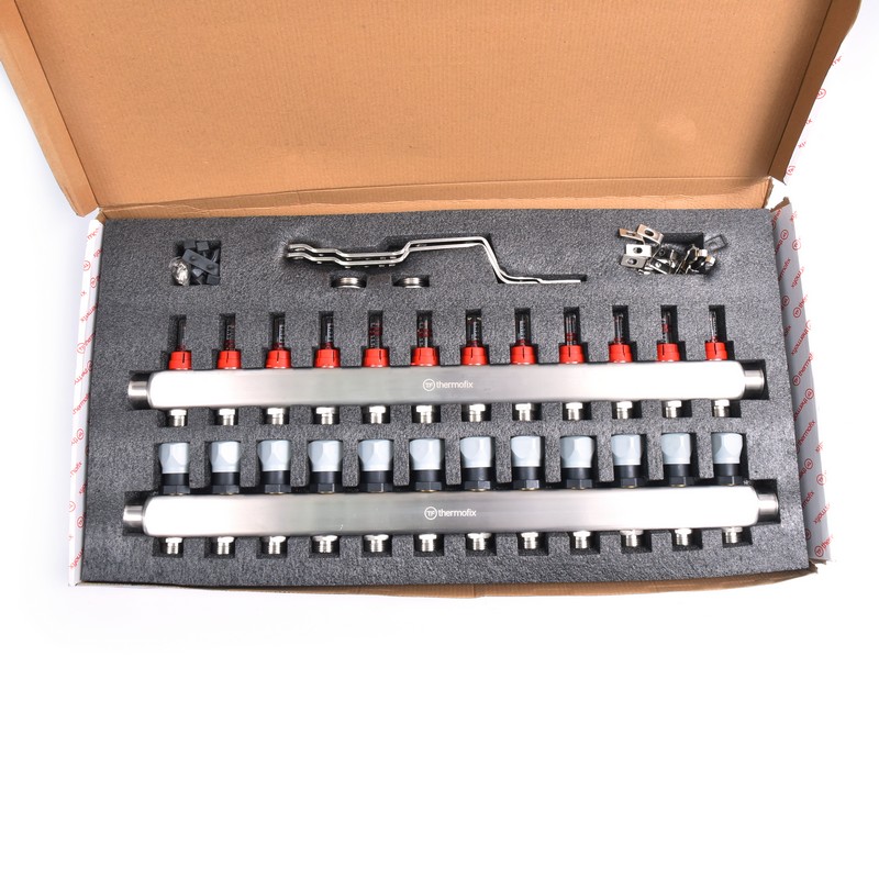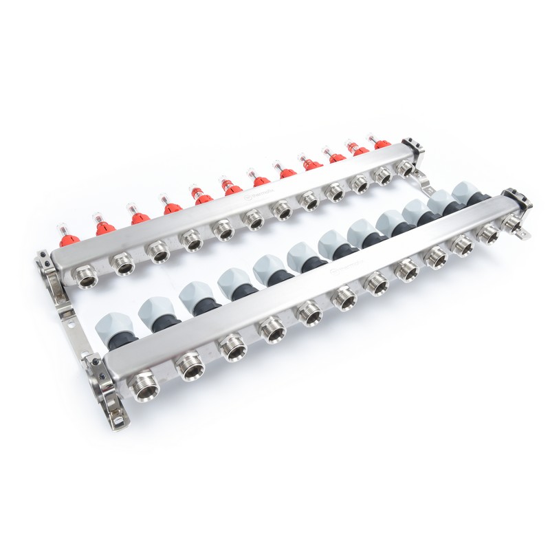 Каждая из труб системы подключается к коллектору, что позволяет контролировать поток теплоносителя индивидуально в каждом циркуляционном контуре.