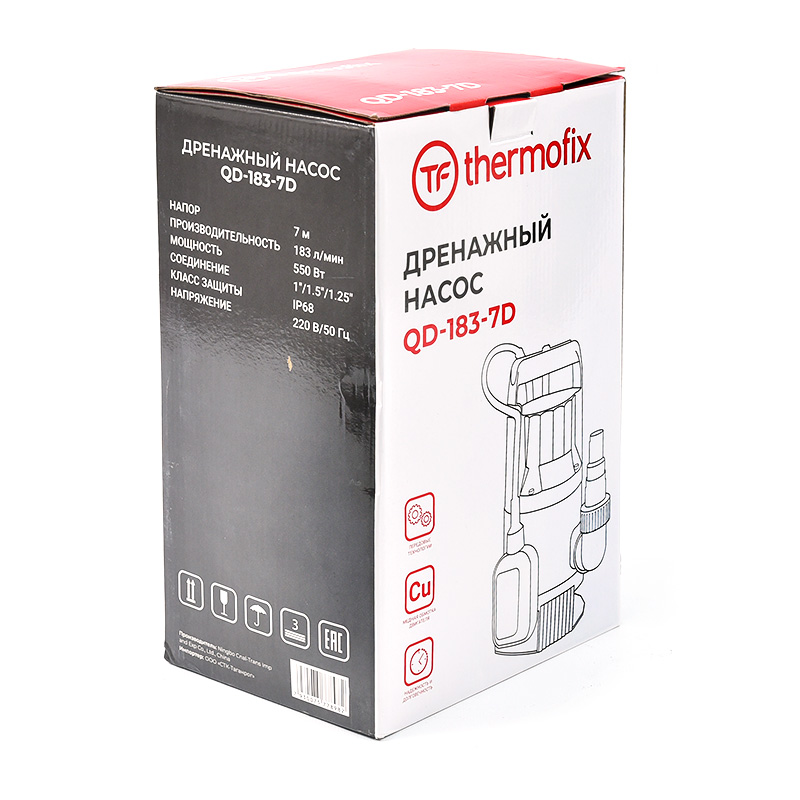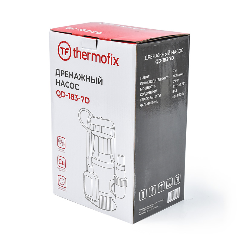 Насосы Thermofix серии QD представляют собой центробежный электронасос, электродвигатель которого приводит в действие рабочее колесо, при этом давление на выходе растет, и вода поступает в трубопровод. Корпус погружного насоса изготовлен из высокопрочного легкого пластика, использование которого предохраняет насос от коррозии, а также значительно уменьшает общий вес. Это продлевает срок эксплуатации насоса и предохраняет его от внешних ударов и повреждений. Конструкция корпуса насоса позволяет использовать его при любом температурном режиме. Расположение электродвигателя в корпусе насоса обеспечивает его охлаждение перекачиваемой водой. В насосах предусмотрен специальный выключатель, который автоматически срабатывает при достижении критически низкого уровня перекачиваемой жидкости. Конструкция насоса не позволяет ему работать вхолостую, что значительно продлевает срок его службы и предохраняет от ошибок при его эксплуатации.