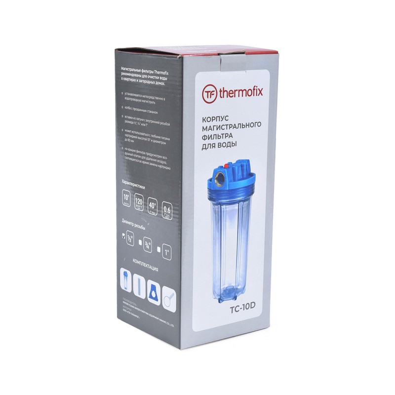 Фильтр Thermofix TC-10D устанавливается непосредственно в водопроводную магистраль. Отличительной особенностью данной модели является крепление колбы и крышки без использования накидной гайки.
