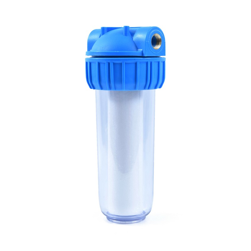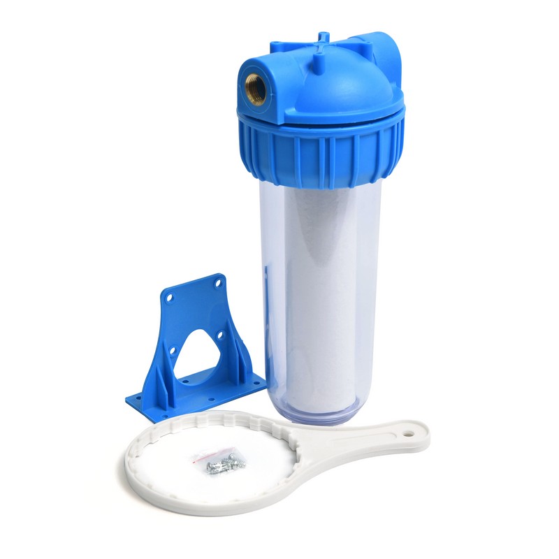 В комплект входят: сменный фильтрующий элемент из вспененного полипропилена, кронштейн для монтажа на стену и ключ для откручивания колбы.