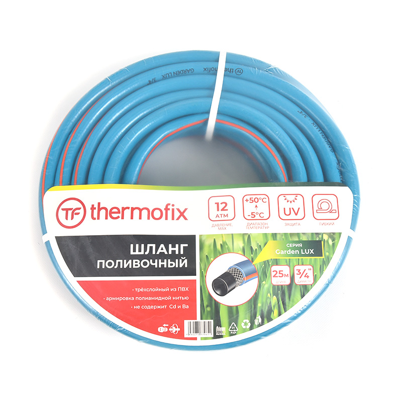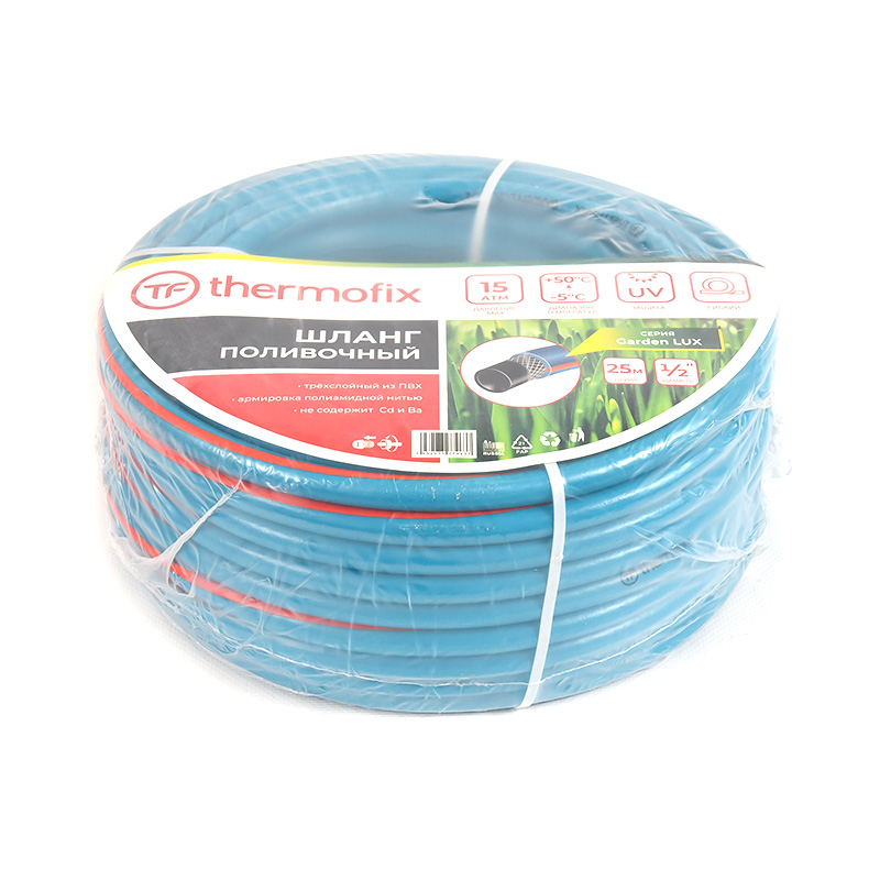 Садовые поливочные шланги торговой марки Thermofix изготовлены из ПВХ с дополнительным армирующим слоем из полиамидной нити. Они гибкие, эластичные и не подвержены воздействию ультрафиолетовых лучей, от которых на многих шлангах появляются трещины.