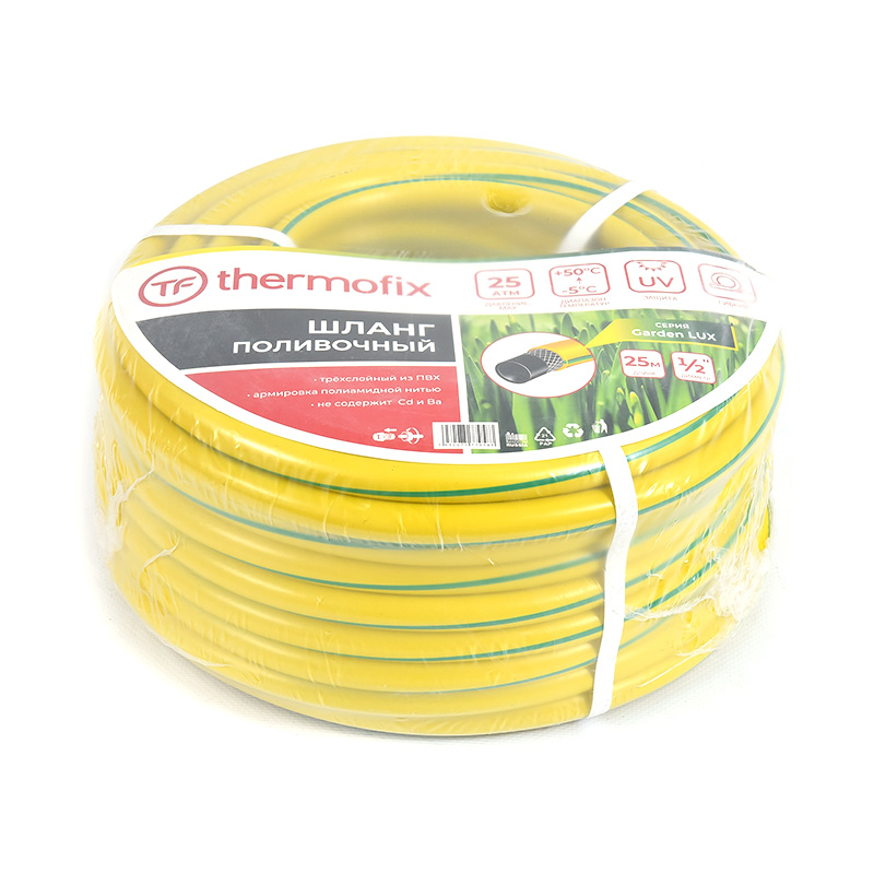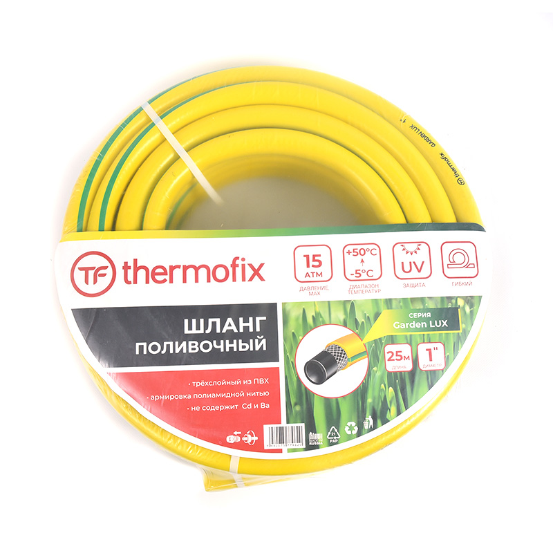 Садовые поливочные шланги торговой марки Thermofix изготовлены из ПВХ с дополнительным армирующим слоем из полиамидной нити. Они гибкие, эластичные и не подвержены воздействию ультрафиолетовых лучей, от которых на многих шлангах появляются трещины.